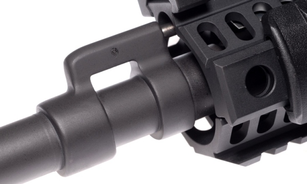 This close-up shows the SA gas block in fine detail with its taper pins contoured to the bottom radius. You can also see that the gas tube location is much higher than a standard AR-15 carbine and requires a Colt 6940 gas tube (straight). This design allows the special barrel nut wrench to fit between the gas tube and barrel.