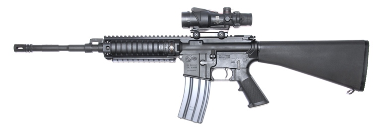 The LE6944 Operator shown in this photo has a 14-FIVE-16 inch Colt 1/7 chrome-lined barrel with a pinned/welded SA M16A2 compensator, the Reliabilty Package (RP) mods, the 694X-Operator gas block, and the upper receiver machined for KAC military rail covers (optional). It also has Troy special production back-up folding sights.