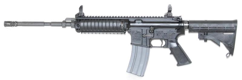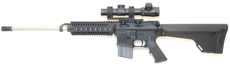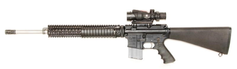 The rifle shown above has been set up for optic-only use with an ACOG scope and Knights Armament Co. (KAC) military rail panels. Various Back-Up-Iron-Sights (BUIS) can also be mounted to the rail system and upper receiver, forming a 19 inch sight radius. This particular rifle belongs to a Los Angeles County Sheriff's Deputy from the Special Enforcement Bureau (SEB). It is mission capable in a wide variety of precision applications.