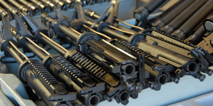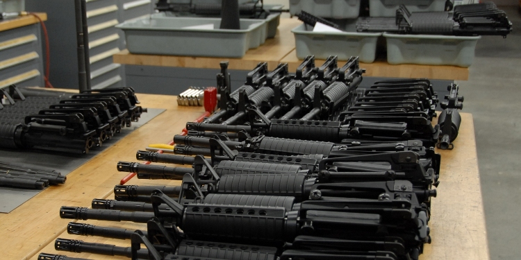 Several Colt weapons and components being organized for Reliability Package upgrades, Operator production, and various custom work in one section of the old machine shop. Specialized Armament, Chandler, Arizona (1993-2012)