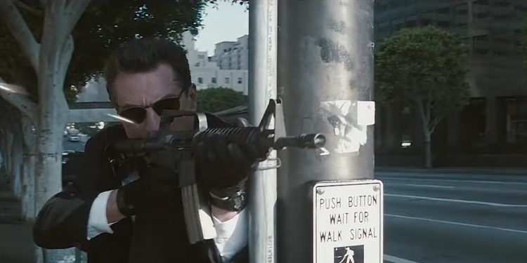 "HEAT" - (1995). Robert De Niro taking a supported shot on FULL-AUTO with a Colt R0733 Commando, running through downtown Los Angeles, with a duffel bag full of cash. This M16A2 series weapon has been modified to fire blank cartridges and is refitted with an M16A1 flash suppressor to provide a symmetrical flash pattern. Unfortunately, with approximately a 900+ rd/min rate of fire, and spraying ammunition all over the place, this weapon would have been empty in less than TWO seconds. (2-3 long bursts - and OUT). The real LAPD SWAT Team would have destroyed these 2 men before they got off the street. The cool, high-speed antihero only survives in a Hollywood movie!