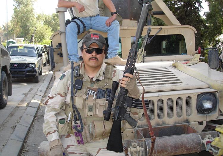 This photo of Tony in Iraq shows him operating with a suppressed MK12 rifle. This particular weapon has a KAC rail system and covers along with an early 1960’s Colt AR-15 fixed buttstock and rear sling swivel. The MK12 SPR’s are truly “Franken-Rifles” since there are numerous versions, unit/operator modifications, individual accessories, and everything is pieced together in one way or another - many MK12's are built on old M16A1 lower receivers. Almost no two are exactly the same.