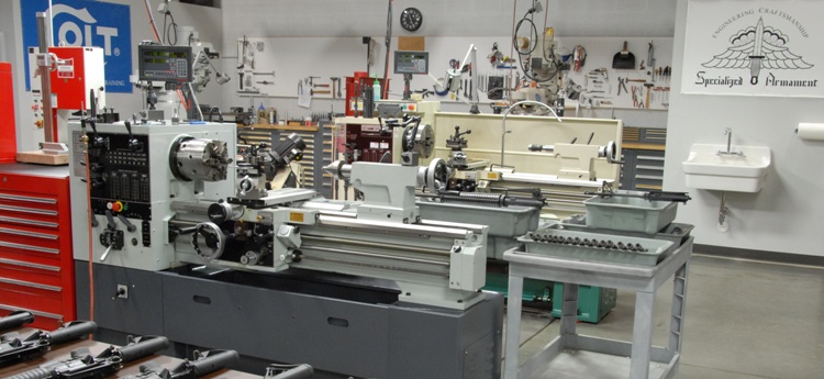 Final Assembly - This busy section is where nearly all shop work ends up. Every aspect of a work order, custom build or SA project has to come together perfectly right here. A great deal of specialty tooling has been designed and fabricated to support this area and various weapons systems. These fine quality tools, fixtures, and gages allow us to focus on the precision craftsmanship that SA is known for. The highlight of this area - it controls the shop stereo, volume and Sirius/XM station of choice! Twin 1800W amps driving FOUR giant JBL club speakers.