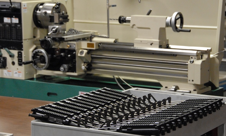 Shop cart with 25 Colt upper receiver groups being machined and modified for suppressed application. These special 10 inch police barrels will next have their threaded sound suppressors semi-permanently attached before heading to test-fire and final inspection. In the background: One of our 3 workhorse RML-1640 lathes with the cross slide covered in chips. This is the 1640V with a 5 HP motor which is infinitely variable between 20-2500 RPM and an ER40 collet holder sticking out of its MT4 tailstock. Our 1640G has a taper attachment installed and a production 5C quick-change collect system. Our new 1640M is a special order machine with a metric DIN 103 trapezoidal thread lead screw for working in millimeters. The only machine in the shop that can make left-hand metric threads correctly (like the FN P90). Our original AT-1340 (visible in other photos) has been converted into a special purpose grinding machine after many years of hard use. Put out to pasture in the lathe world, but still pulling duty like an old Sergeant.
