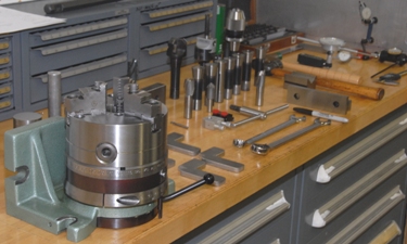 Sunday morning in the machine shop. The perfect time to work on individual projects when no one is on the clock - cars, motorcycles, ATV's, custom furniture, super-bbq's, private gear, etc, etc... That is our RML-1640G in the foreground, with an 8 inch Bison 6-jaw chuck mounted. All of the SA lathes have the precision Dorian Quadra Index Tool Post systems (QITP30N) with a huge amount ot standard, modified, and custom tooling. Right behind the 1640G is the 1640V with a 10 inch South Bend 4-jaw chuck and a pile of work for someone. Directly to the left sits our small horizontal band saw and the Dake/Johnson F-16 vertical band saw. Further back you can see 2 of our 3 milling machines, a Sunex 20 ton press for various applications, and dozens of drawers full of support tooling: mostly cutting tools, jigs, fixtures, workholding and measuring equipment. This area takes up about 10% of the entire shop.