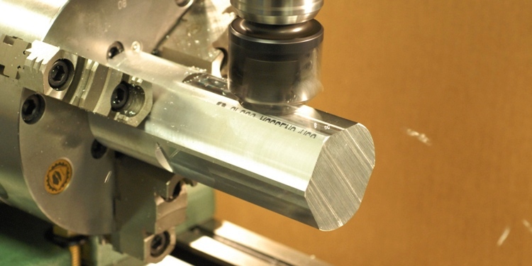 A three inch diameter section of 7075T6 aluminum bar stock being cut into a fixture for the 6940 Operator. This complex geometry will allow us to machine the Colt front sight base into a precision gas block using a 10 inch rotary table. LE6944 Operator