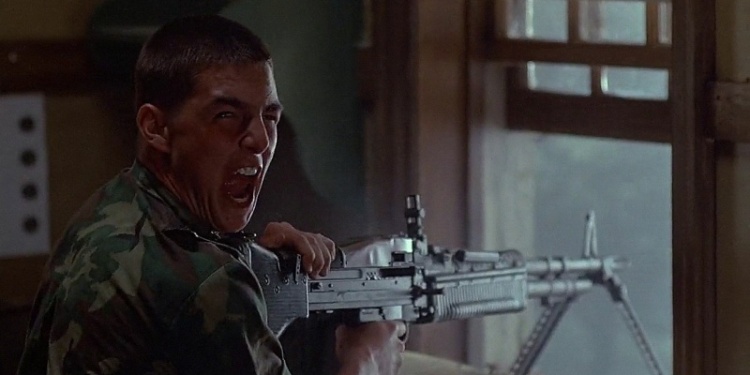 "TAPS" - (1981). A young Tom Cruise wearing Vietnam era ERDL (green-dominant, "lowland") camouflaged "jungle fatigues," firing the M60 machine gun from an elevated, reinforced position. His final words are, "IT'S BEAUTIFUL, MAN...," right before a US M48A5 Main Battle Tank opens fire at close range with 3 machine guns (a heavy Browning M2 .50 Cal. MG, along with two 7.62mm weapons) and devastating consequences!