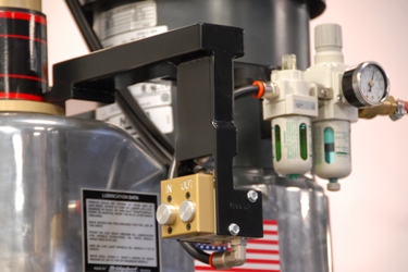 Ken's Bridgeport milling machine with nearly every upgrade possible. The Torque-Rite power drawbar kit presented some special challenges, since there is virtually no place to bolt any mounting hardware on the Bridgeport 2J head itself. After much deliberation, this design was chosen. The steel pieces were all fabricated on this machine, then TIG welded together and powder coated. The custom mount, which holds both the controller unit and regulator/oiler assy, bolts securely to the top of the head using the two rear cap screws for the bearing cover. (2017)