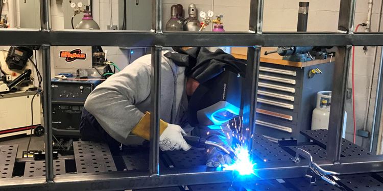 January/February 2017 - Building a new materials rack at SA. That is Ken in his winter outfit and customized 3M helmet MIG welding a deck section on the BuildPro 78”x 38” modular welding table. This deck section is 10 ft x 4 ft and made out of 14 gauge 2”x 3” and 1”x 3” rectangular steel tubing. After grinding, this section will be welded to 2 other sections and a sub-frame standing 8 feet high, then bolted to the east wall of our building. Nearly all of our steel and aluminum bar stock will be stored on this monster welding project, composed of 94 separate steel pieces and over 400 individual welds. Most of the welding will be done with the new Miller 350P pulse MIG welder. The end caps were welded with our Miller Syncrowave 200 TIG machine visible in the background. There are always company and private projects in the welding area.